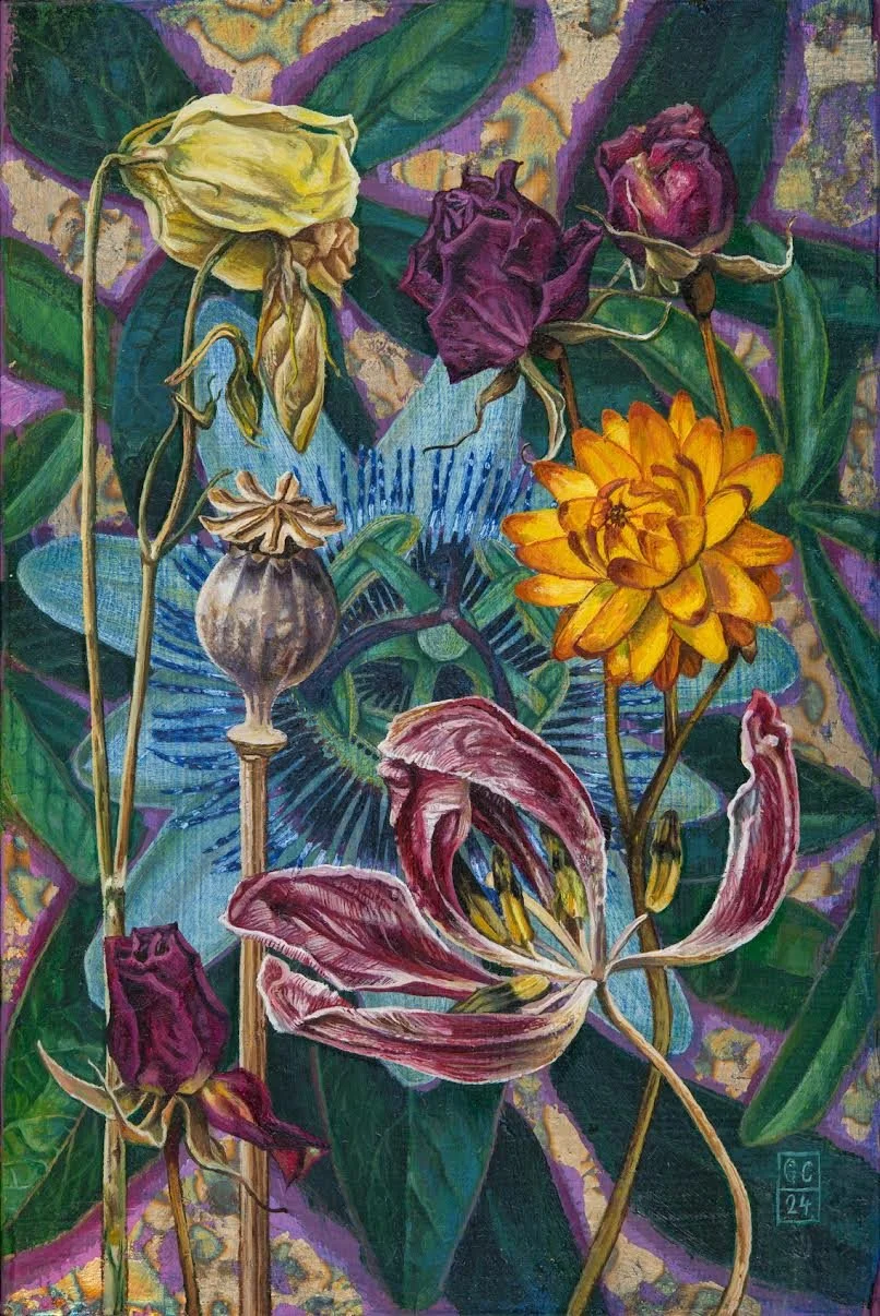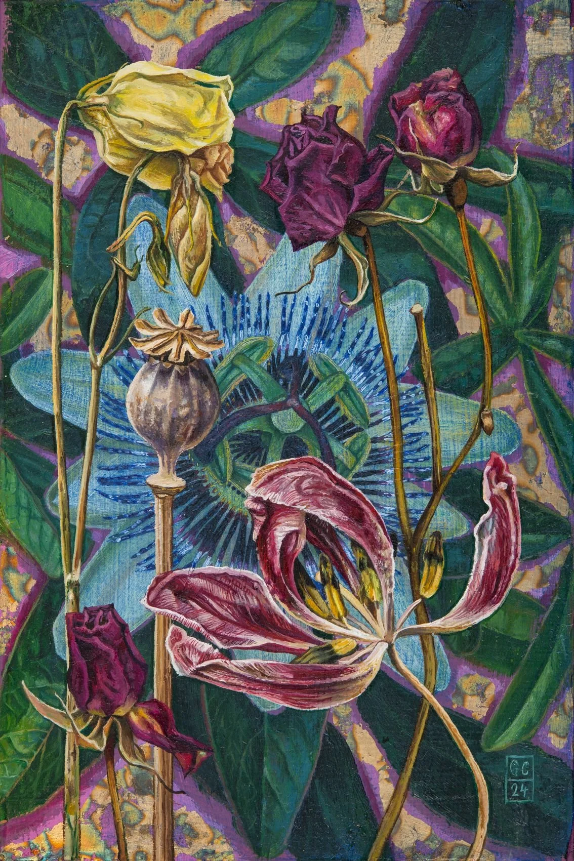 Passionflowers, oil and gold leaf on panel, 15 x10cm £975