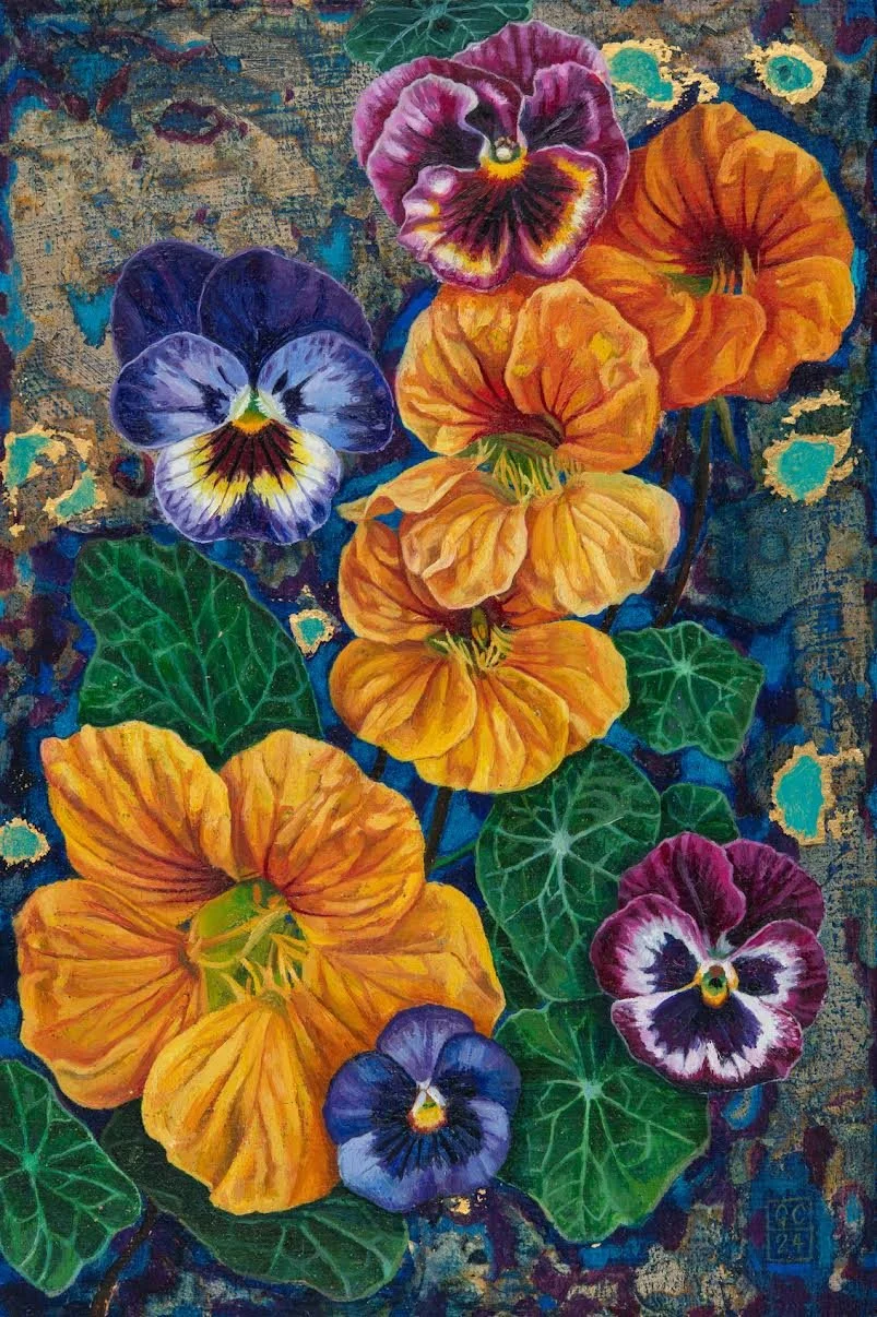 Pansies and Nasturtiums, oil and gold leaf on panel, 15 x10cm £975