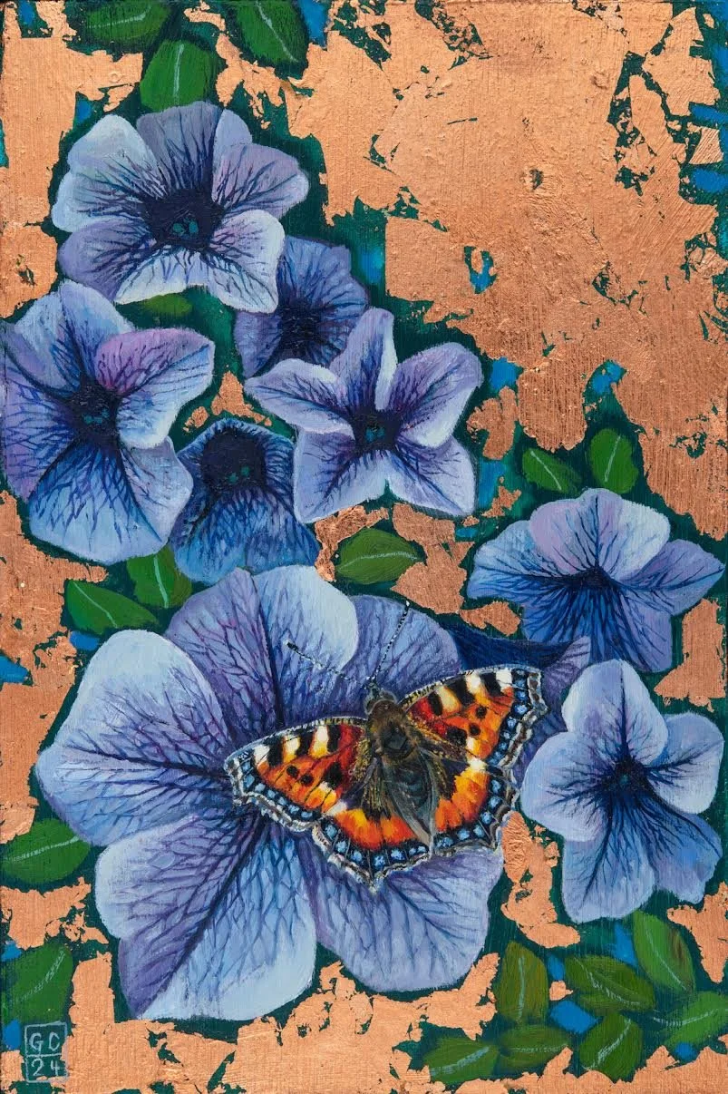 Petunias and Small Tortoiseshell, oil and copper leaf on panel, 15 x10cm £975