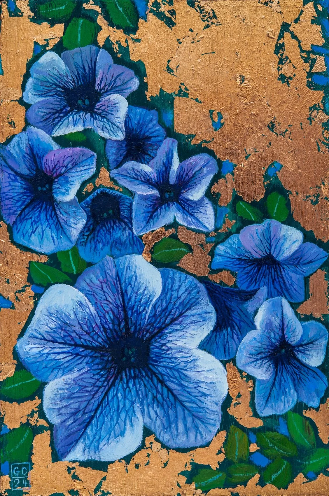 Petunias, oil and copper leaf on panel, 15 x10cm £975